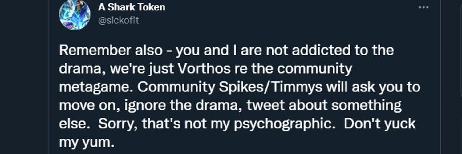 I don’t want to talk about drama but rather the drama metagame. After a one year hiatus, we had a single tweet from one of the forefathers of Magic toxicity: